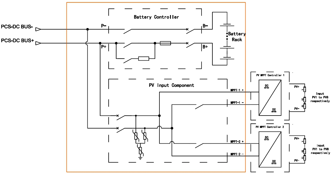 4. Akumuliatoriaus energijos kaupimo sistemoje yra vieninga nuolatinės srovės įvesties sąsaja ir akumuliatoriaus valdymo dėžutė, skirta automatiškai valdyti fotovoltinį MPPT, kad būtų apsaugotas akumuliatoriaus įkrovimas.